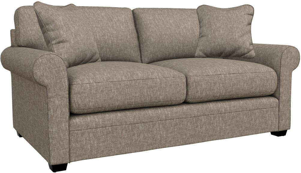 Rolled arms, decorative wood legs and welt trim lend laid-back sophisticated style